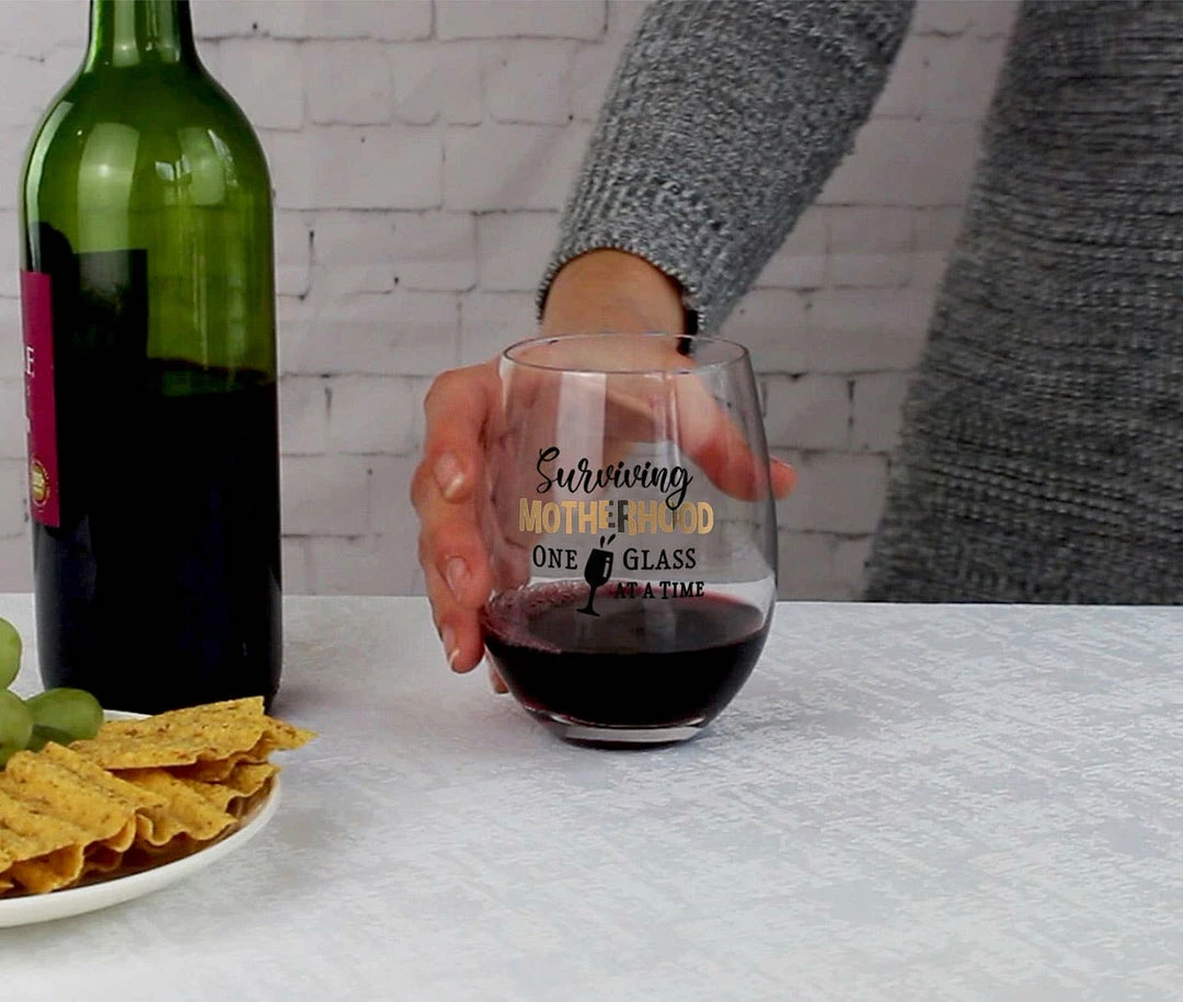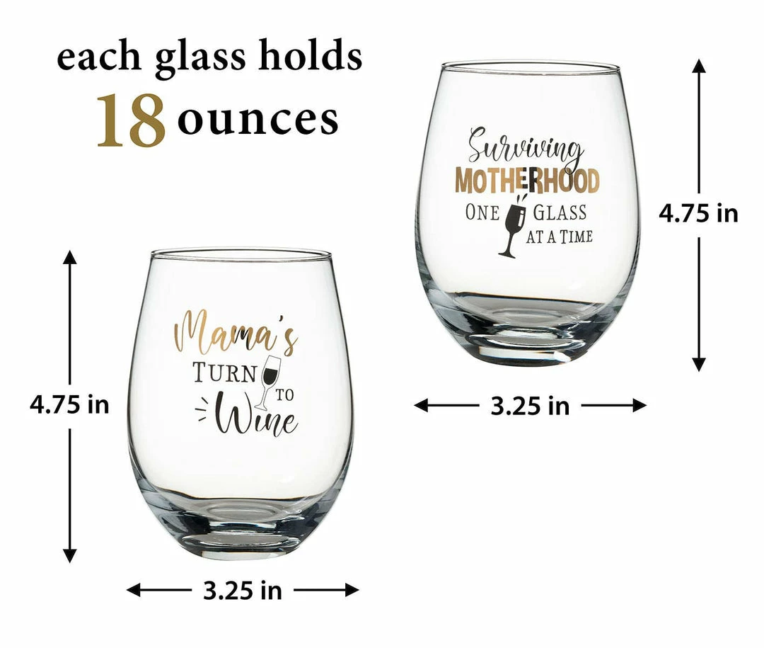 Raise a glass for Moms. The perfect gift for a busy mom and wine lover connoisseur. The wine glass holds 18 ounces of liquid and are 4.75 inches tall.