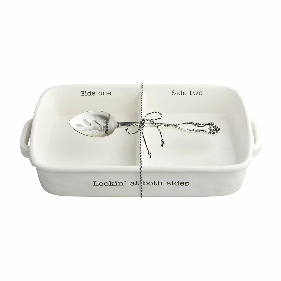 Side one or side two? Serve your favorite sides with our side dish serving set. The two piece set comes with a sectioned ceramic dish and a slotted silver-plate spoon. The front of the dish reads “Lookin’ at both sides”. The inside reads “Side one” on one side and “Side two” on the other. The spoon reads “sideways”. Crazing is a natural feature of ceramics that occurs over time, if your item begins to craze, don’t worry! This item is still food safe. We do not recommend taking a baker straight from the refrigerator to the oven or vice versa.