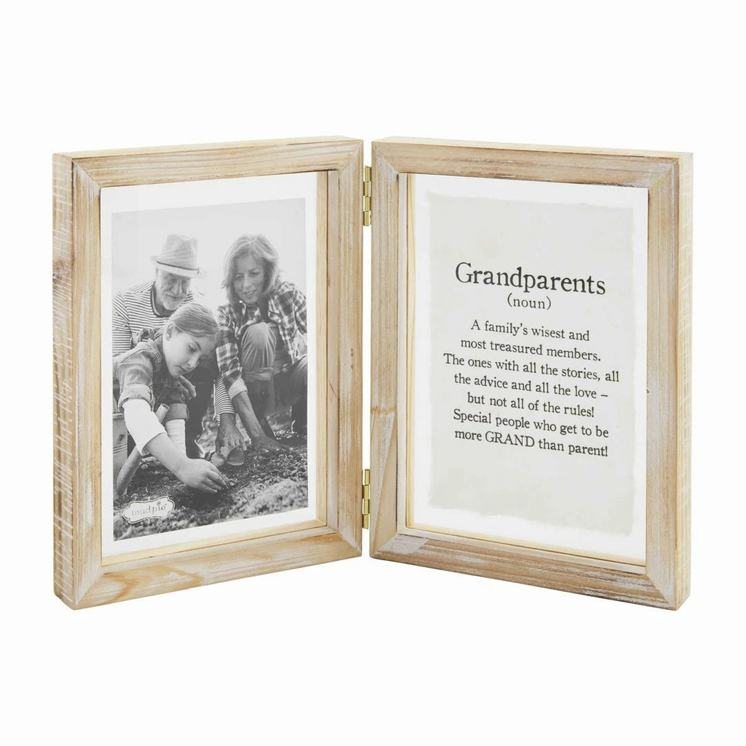 Honor the family’s wisest and most treasured members with our Grandparents Hinged Picture Frame. The hinged wood double frame features pressed glass panes with sentiment parchment paper. The other sides has a 4″ x 6″ photo opening. The frame reads “Grandparents (noun) A family’s wisest and most treasured members. The ones with all the stories, all the advice and all the love – but not all of the rules! Special people who get to be more GRAND than parents”.
