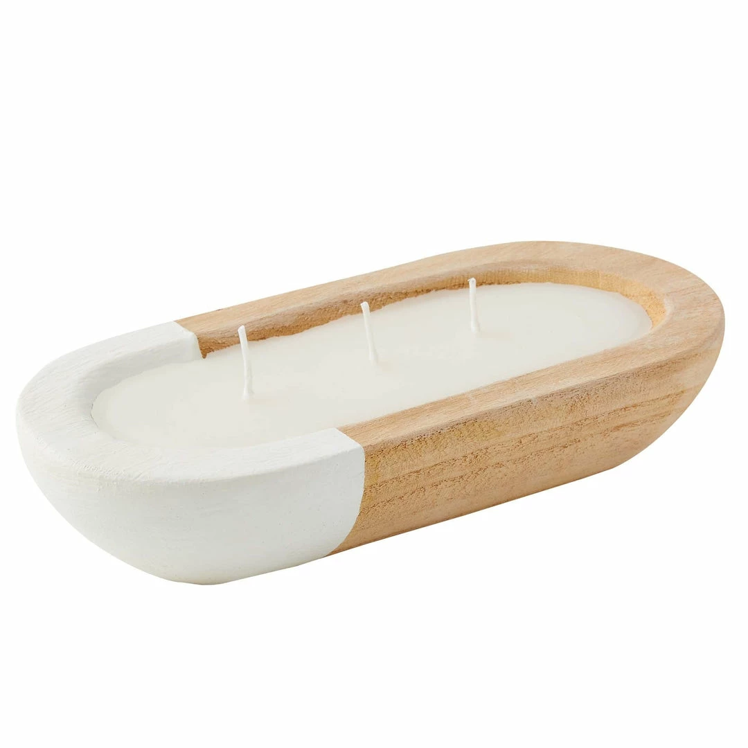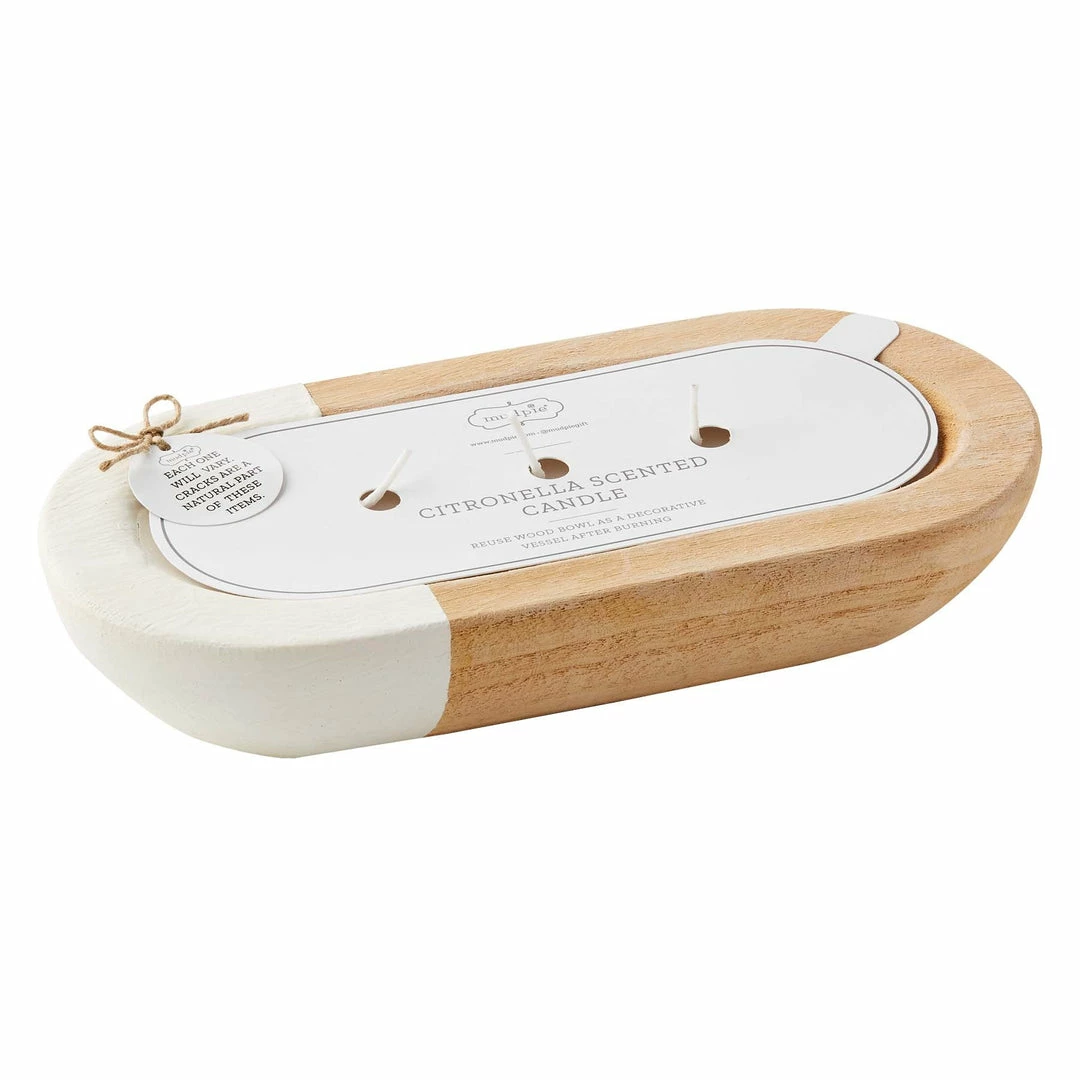 Add this small paulownia citronella candle to your outdoor space. The hand-painted candle features two-tone paulownia wood. The candle features wood and white wood on the candle. The candle features three wicks. This candle has citronella scented wax. Each candle will feature unique cracks.