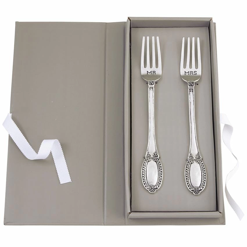 Set of two vintage-style silverplate forks feature engraved sentiments and arrive in book gift box.