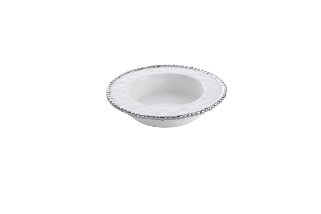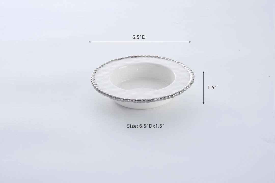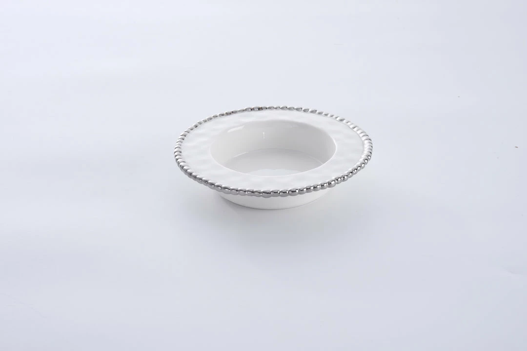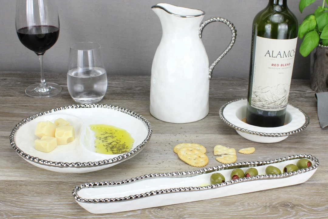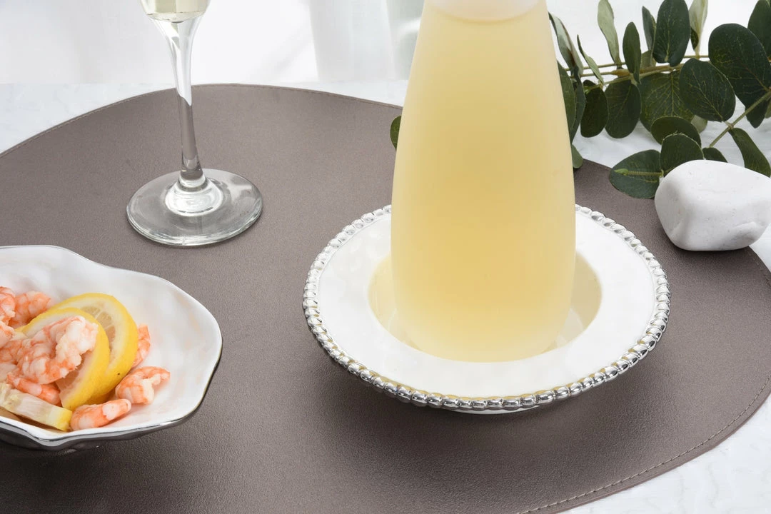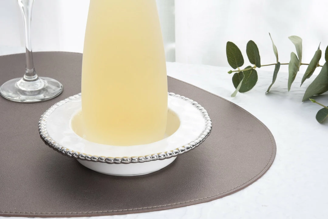 Wine bottle coaster with cork insert in Salerno. Great to give as a gift alone or with a bottle of wine! Every home needs at least one of these gorgeous and practical coasters. Perfect for wine bottles and water bottles, this coaster will prevent drips or condensation from running onto your table! Gleaming white porcelain with lustrous silver beads in titanium. Removable 3mm thick cork insert. Food safe, dishwasher safe, oven safe to 350°. Easy Care.