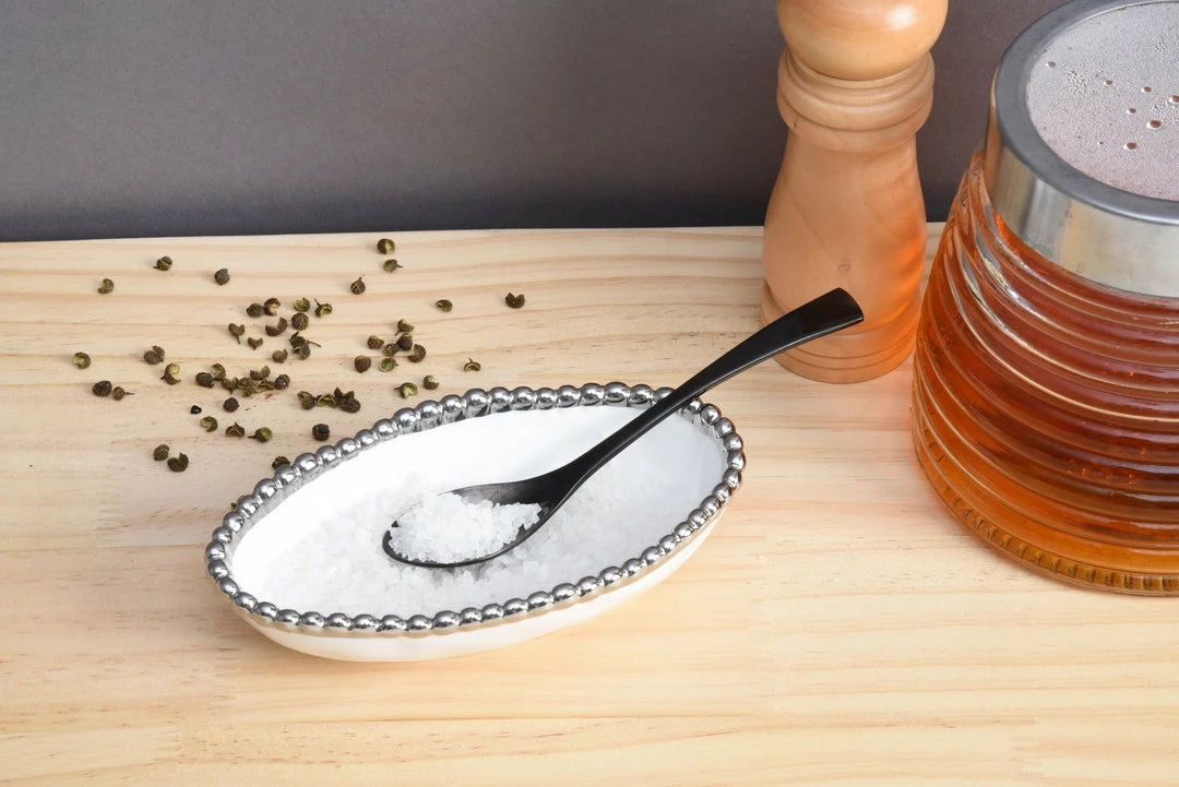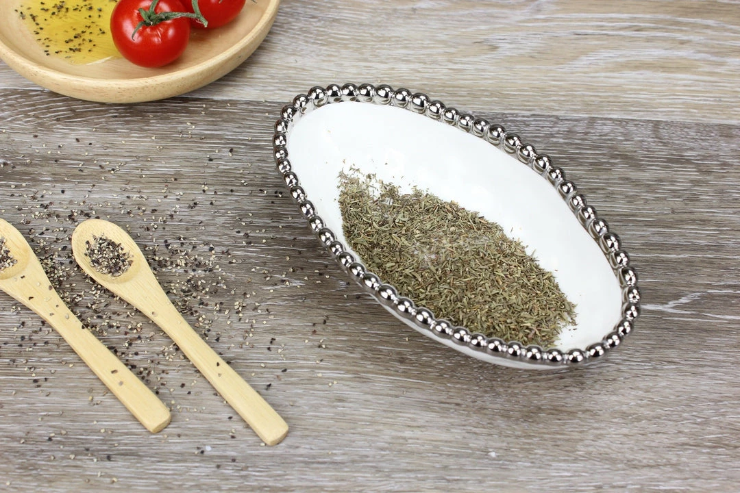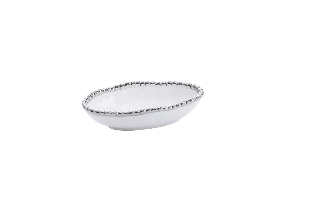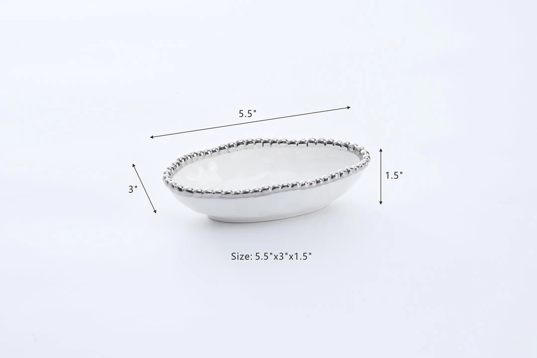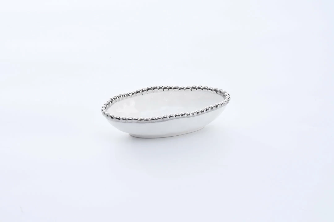 Long condiment bowl in Salerno. Sized to hold olive oils, tapenades and condiments, this bowl offers an effortlessly elegant way to display any sauce or dip. Gleaming white high-fired porcelain with titanium finished silver beading. Food safe, dishwasher safe, oven safe to 350°. Easy Care.