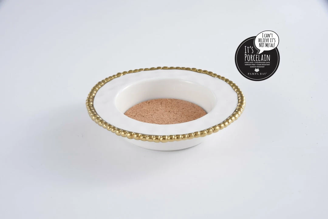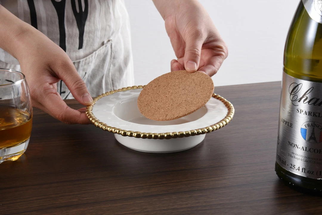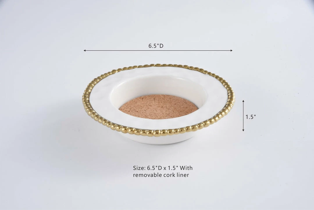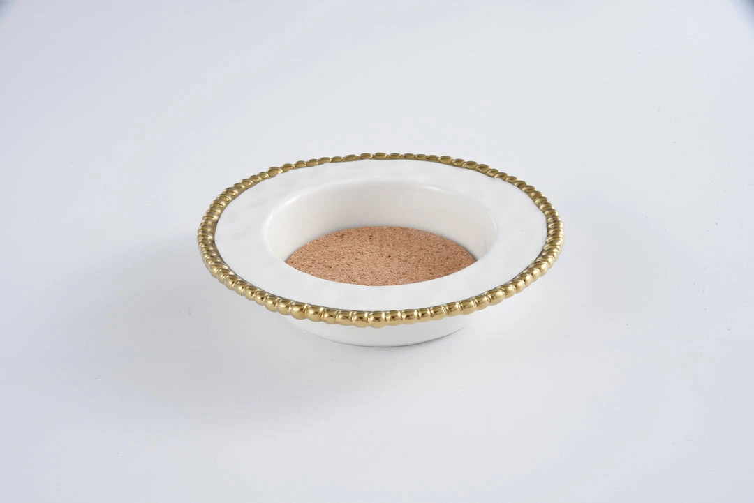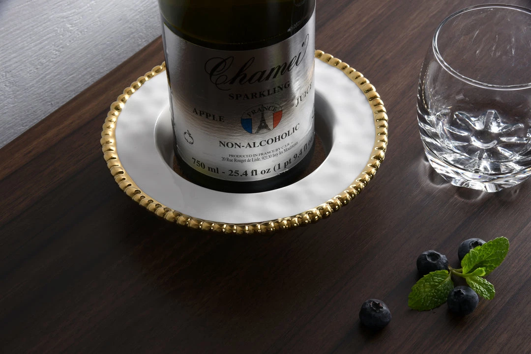 Wine Bottle Coaster with cork insert in Golden Salerno. Great to give as a gift alone or with a bottle of wine! Every home needs at least one of these gorgeous and practical coasters. Perfect for wine bottles and water bottles, this coaster will prevent drips or condensation from running onto your table! Gleaming white porcelain with lustrous gold beads in titanium. Removable 3mm thick cork insert. Food safe, dishwasher safe, oven safe to 550°. Easy Care.