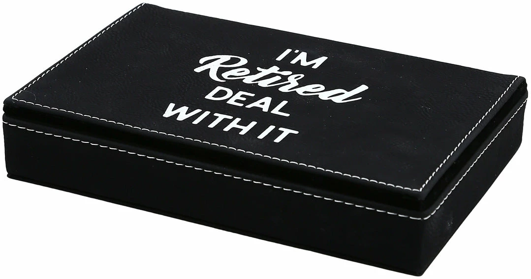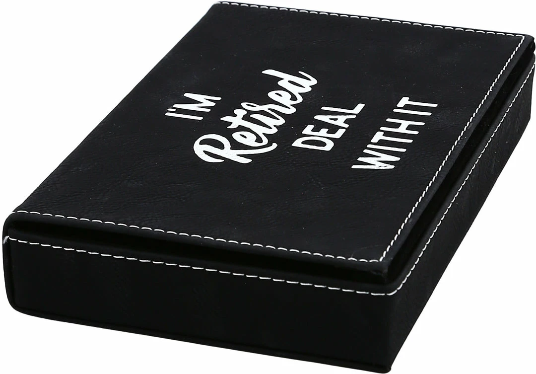 - IN-HOUSE DESIGN: “Retired Life- I’m Retired-Deal With It” is heat stamped on the front of this black dual deck playing card holder. Comes with 2 standard decks of cards and 5 standard 6-sided dice.