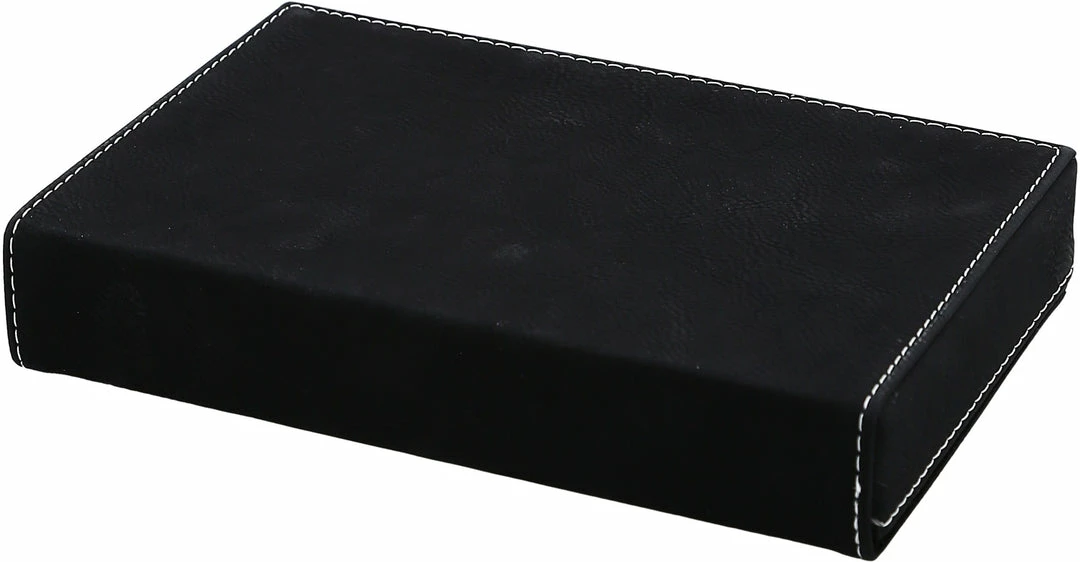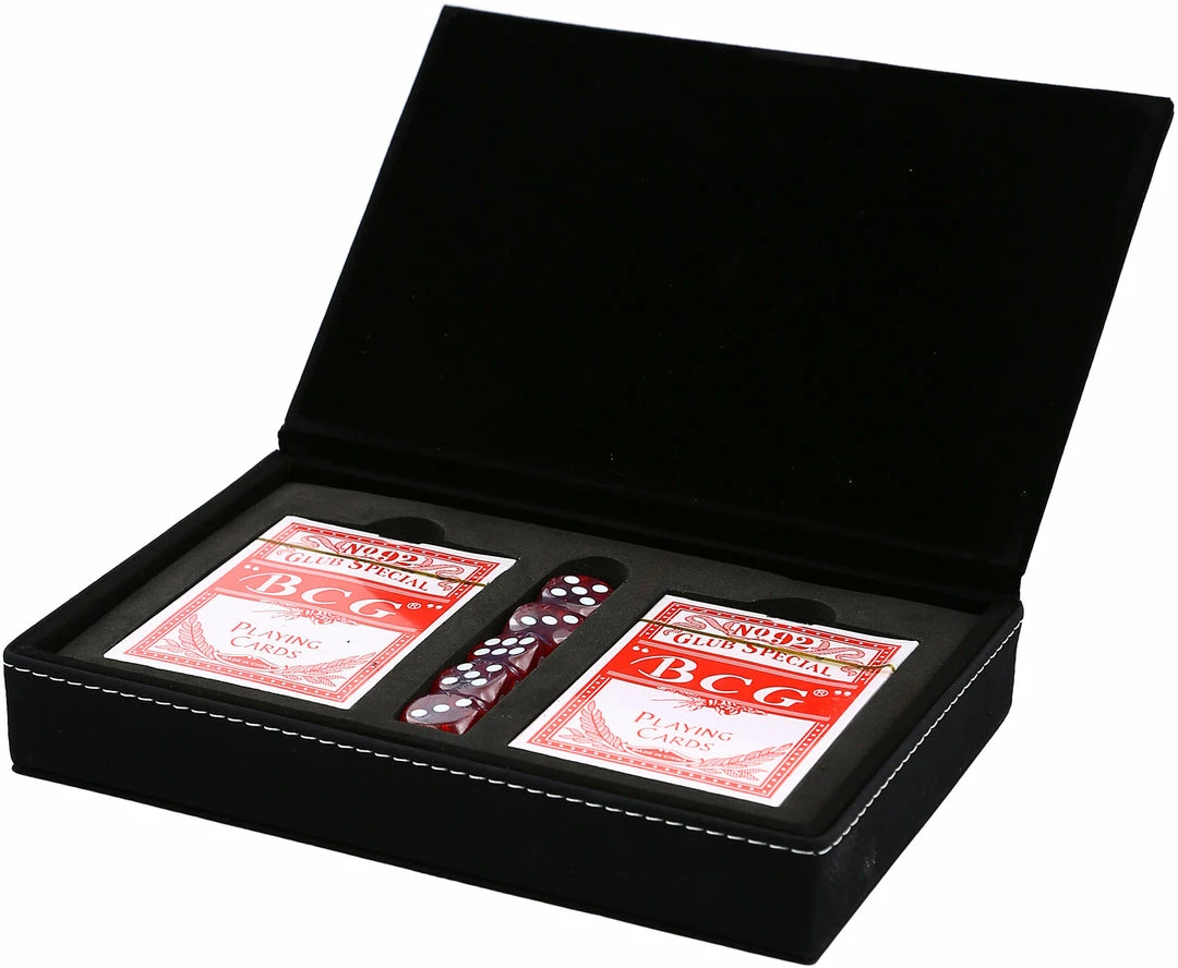 - PREMIUM QUALITY: Black playing card holder – 8 x 5.25 x 1.5″ Polyurethane leather with velvet interior. includes a structured insert to keep cards and dice in place.