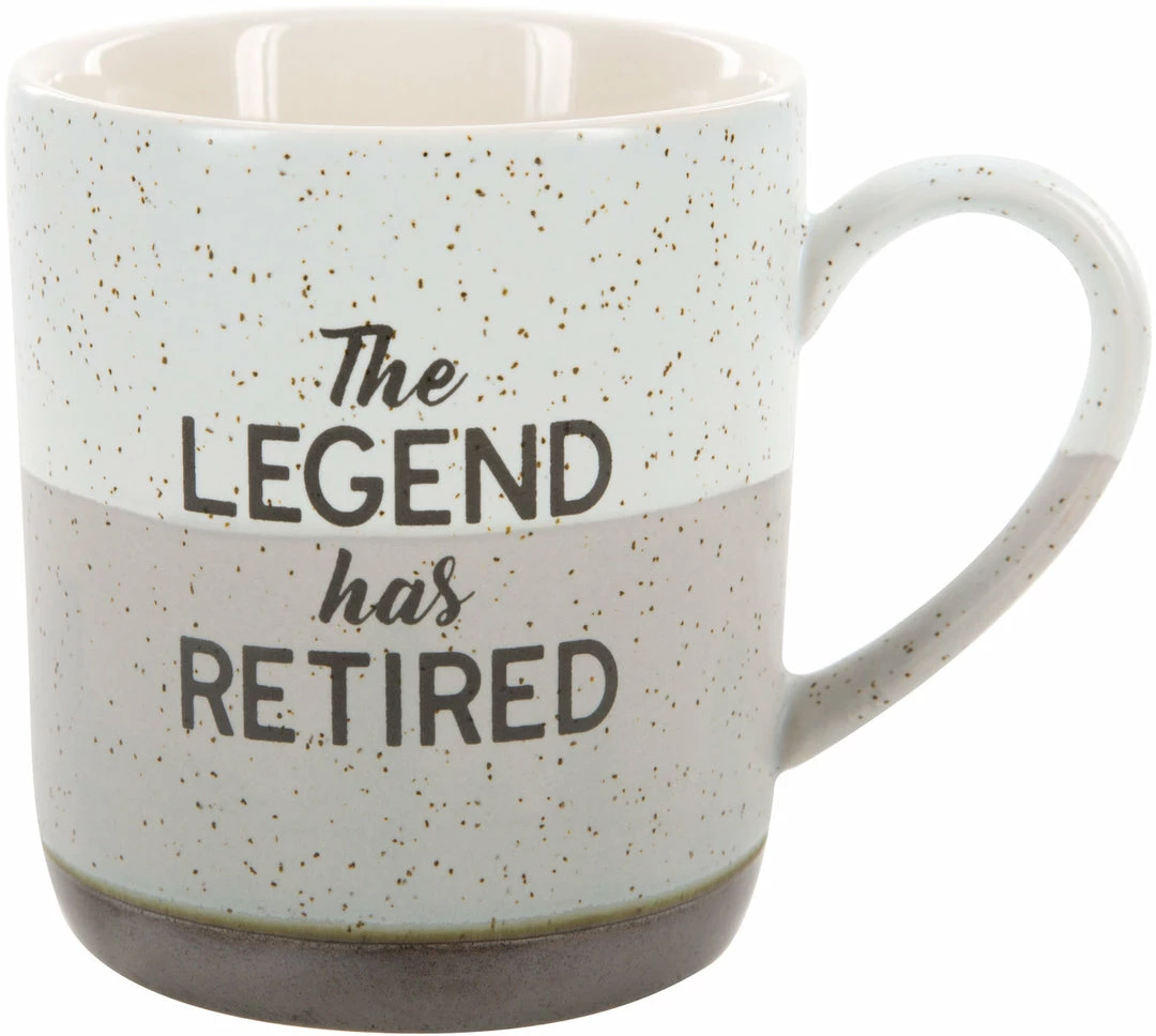 - IN-HOUSE DESIGN: “The Legend Has Retired” text is printed onto the mug on top of a speckled pattern.
