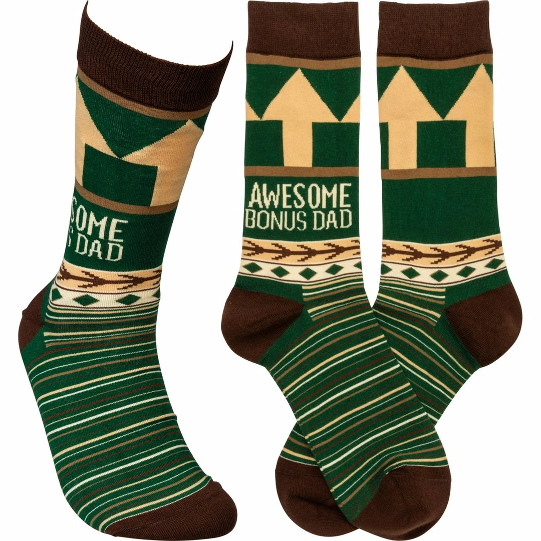 These colorful socks feature woven designs with coordinating “Awesome Bonus Dad” sentiment.