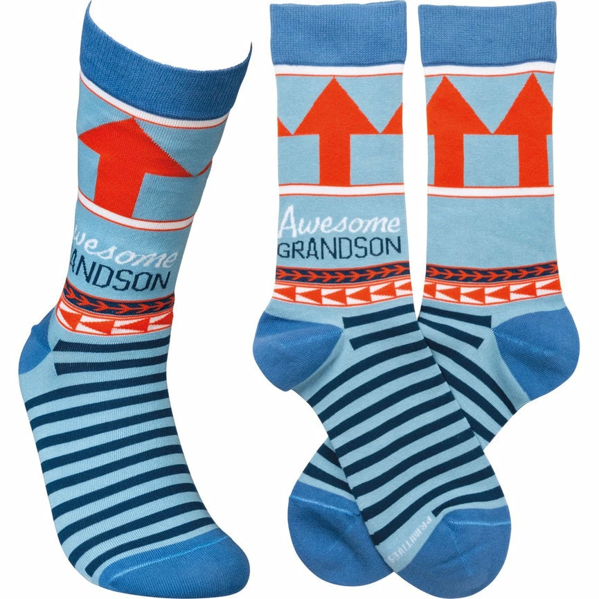 A pair of socks featuring “Awesome Grandson” sentiment with geometric pattern.