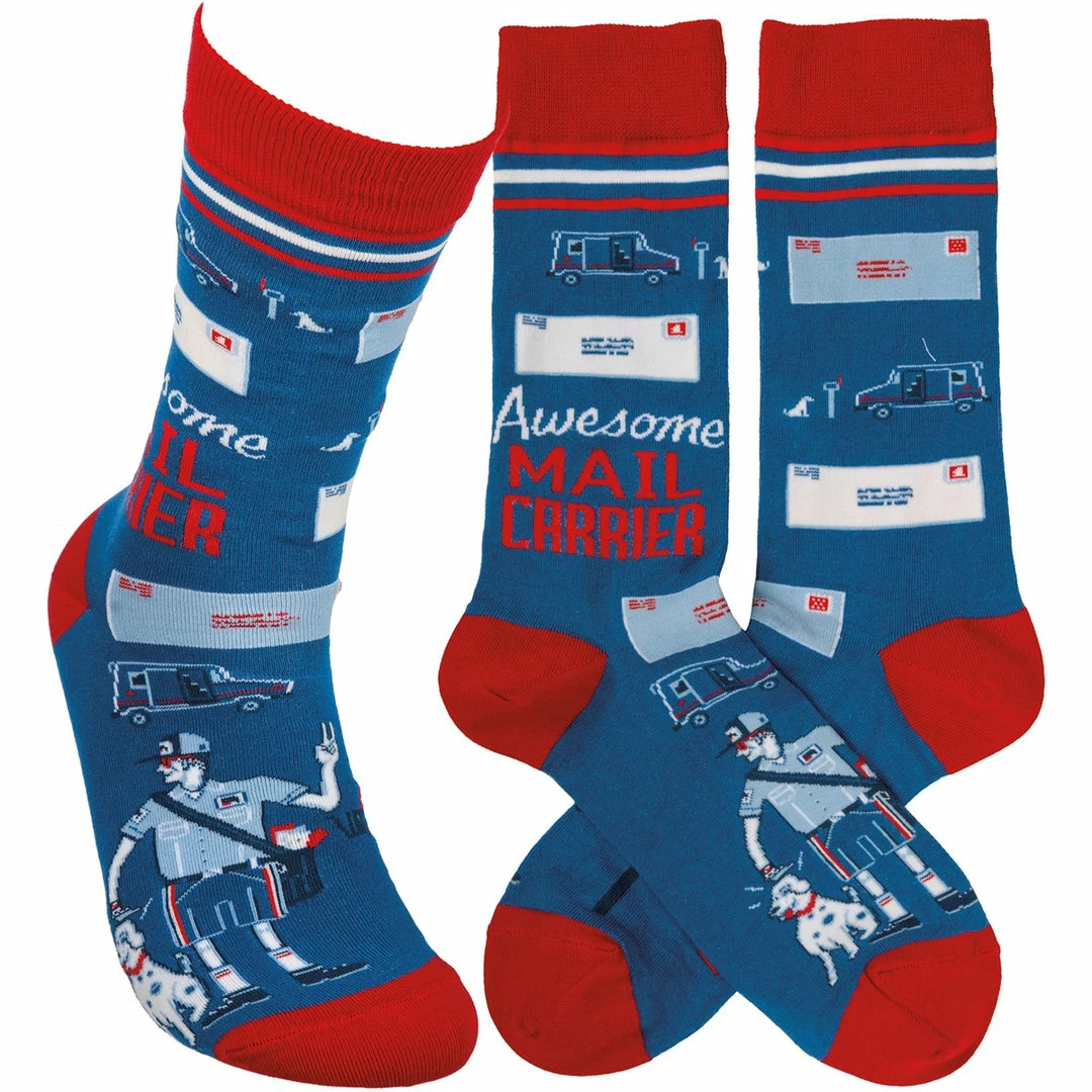 These colorful socks feature woven designs with coordinating “Awesome Mail Carrier” sentiment.