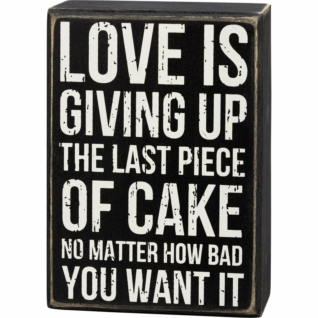 A classic wooden box sign featuring a “Love Is Giving Up The Last Piece Of Cake No Matter How Bad You Want It” sentiment. Easy to hang or can free-stand alone.