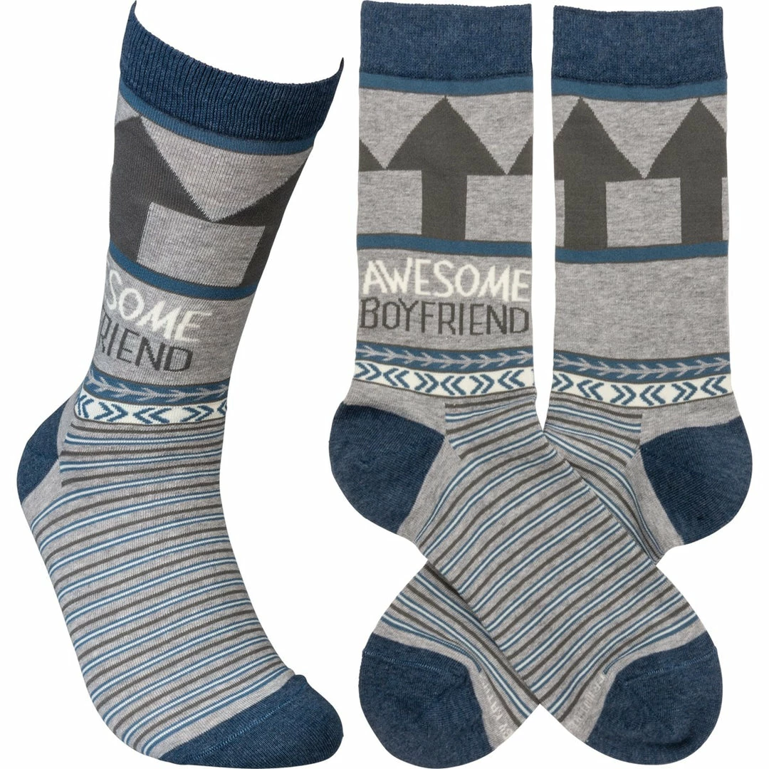 A pair of socks featuring “Awesome Boyfriend” sentiment with geometric pattern.