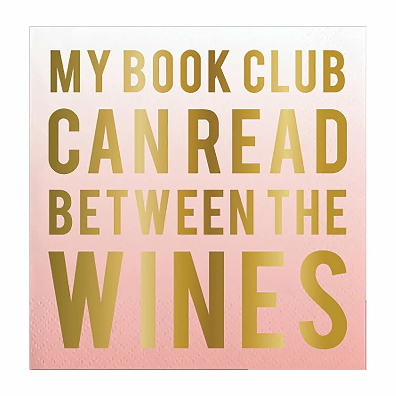 - Two-tone coloration with the phrase “My Book Club Can Read Between The Wines” in gold lettering