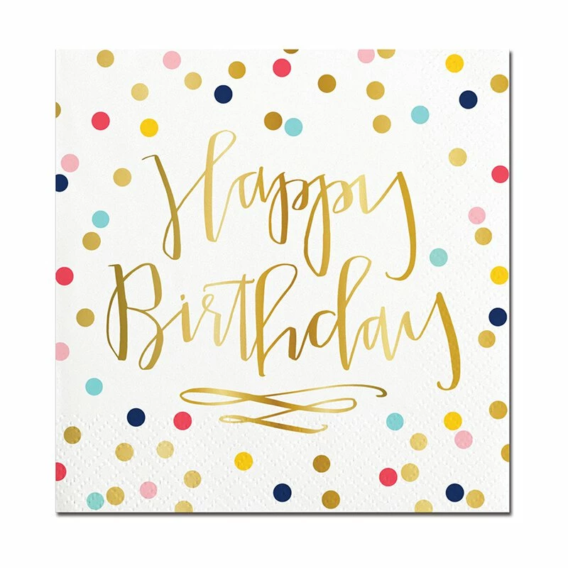 - Polka dot pattern with the phrase “Happy Birthday” in gold lettering