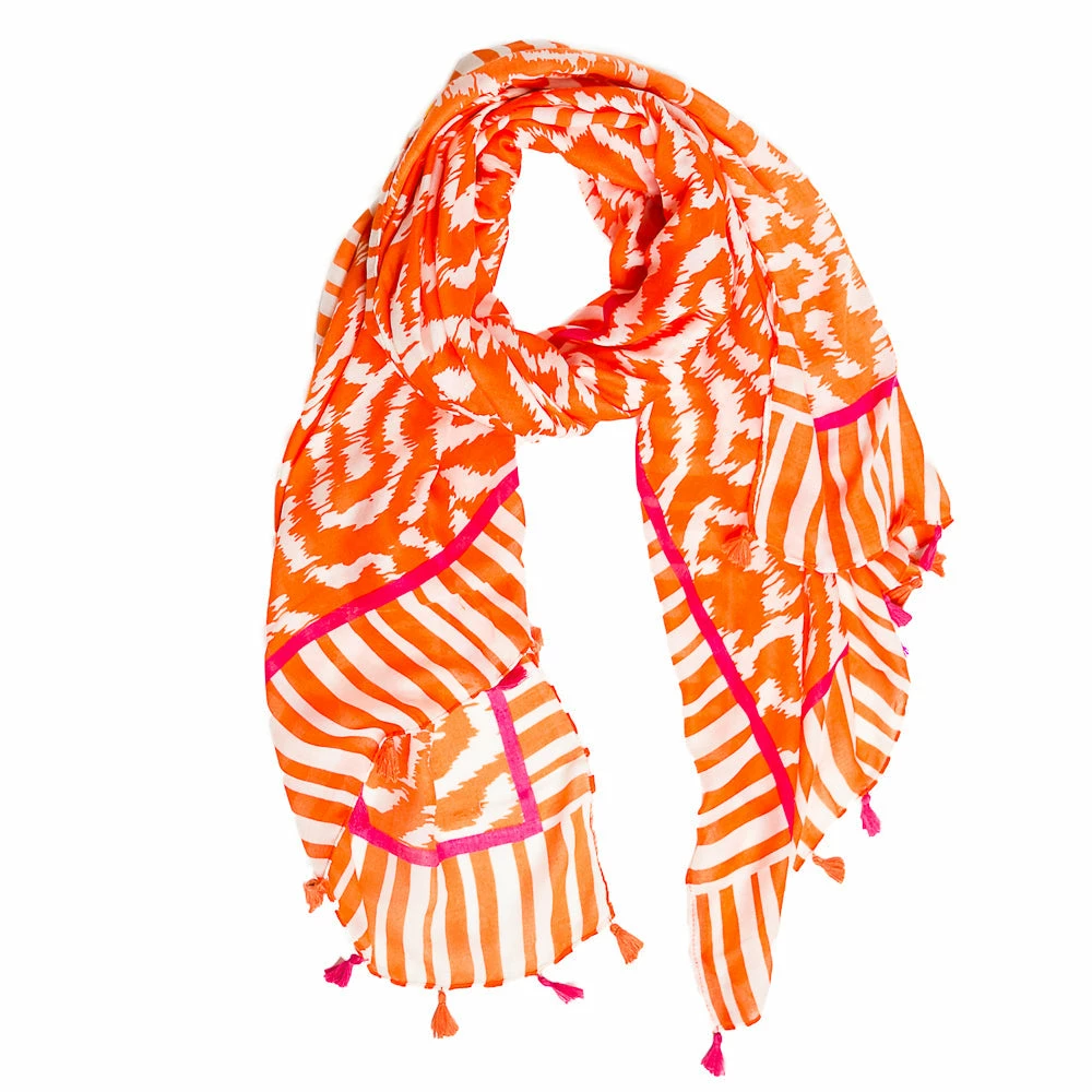 The Alma Scarf adds a pop of color and fun to any outfit. Bright colors and tassels make this oblong scarf an everyday favorite. Looks amazing over a solid color T-shirt!