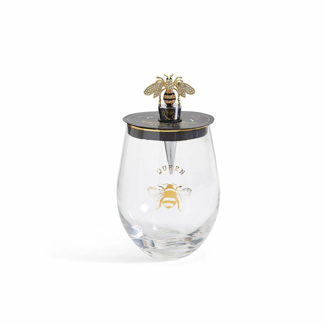 The perfect gift for the wine lover in your life or just for fun, this 16 oz. Stemless glass features a queen bee decal packaged with a beautifully jeweled bee wine stopper. The stemless shaped glass means this is dishwasher safe and less prone to breakage.