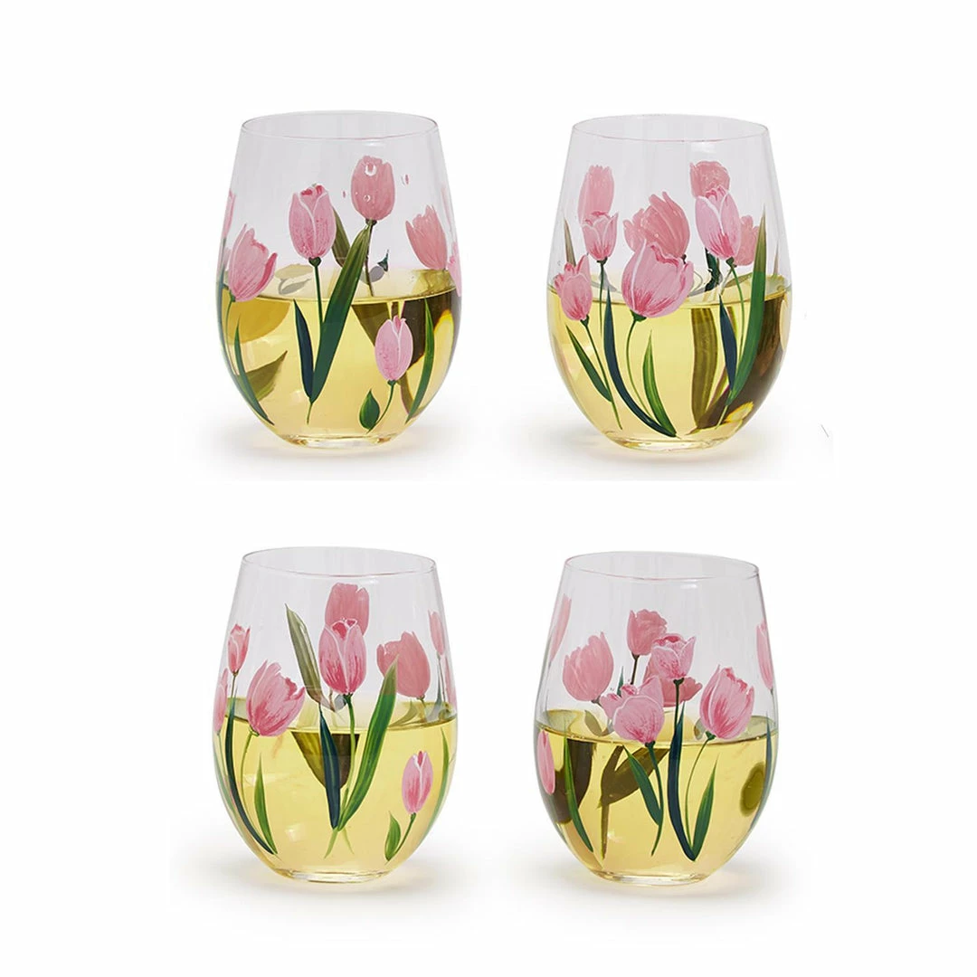 Two’s Company Pink Tulips Hand-Painted Stemless Wine Glass