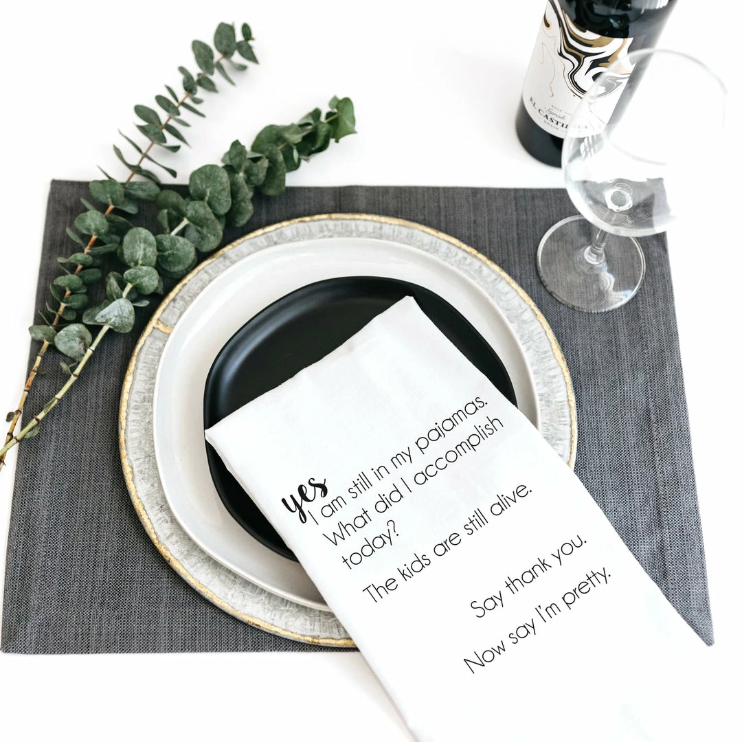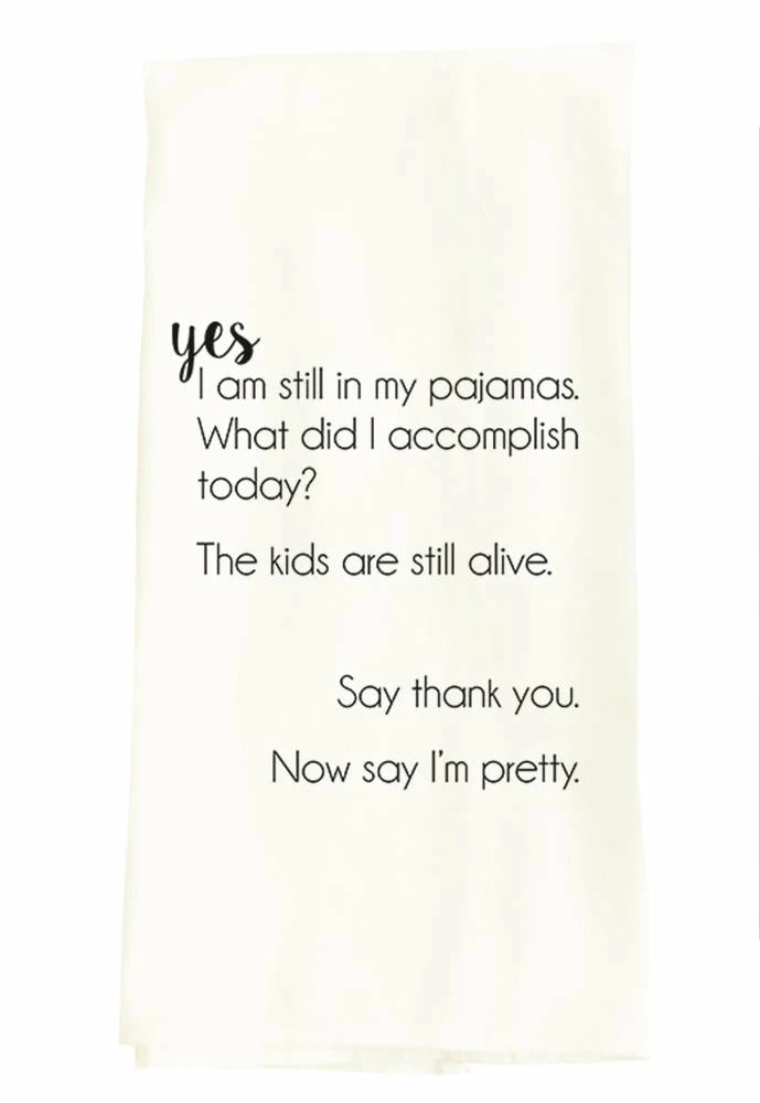This listing is for one flour sack kitchen towel as seen: YES I AM STILL IN MY PAJAMAS. WHAT DID I ACCOMPLISH TODAY? THE KIDS ARE STILL ALIVE. SAY THANK YOU. NOW SAY I’M PRETTY.